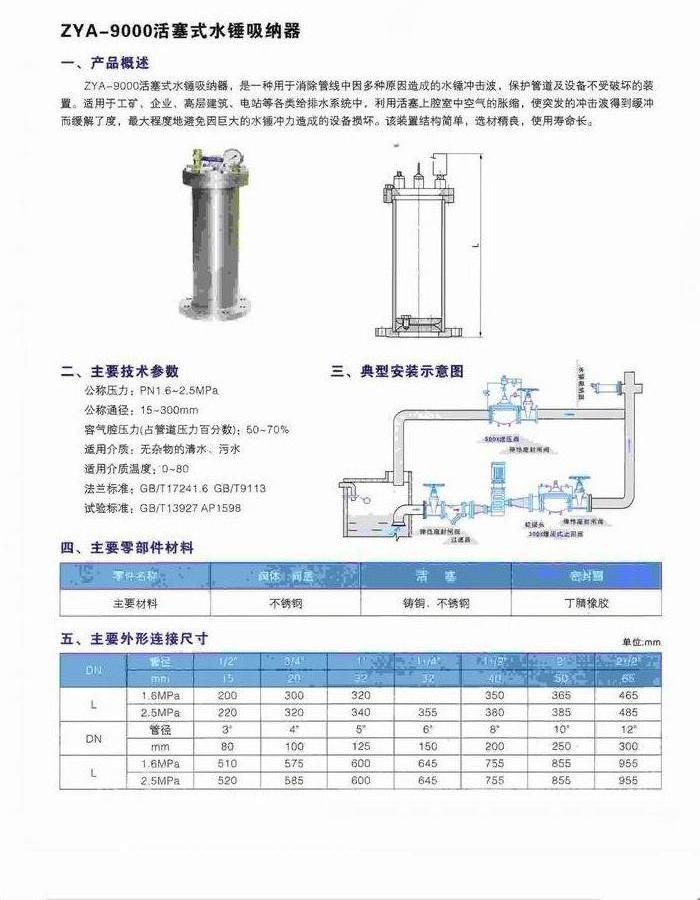 ZYA-9000活塞式水錘吸納器(水錘消除器)是一種用于消除管線中因多種原因造成的水錘沖擊波,保護(hù)管道及設(shè)備不受破壞的裝置。水錘消除器適用于工礦、企業(yè)、高層建筑、電站等各類給排水系統(tǒng)中,利用活塞上腔室中空氣的脹縮,使突發(fā)的沖擊波得到緩沖而緩解了度,最大程度地避免因巨大的水錘沖力造成的設(shè)備損壞。該裝置結(jié)構(gòu)簡(jiǎn)單、選材精良、使用壽命長(zhǎng)。