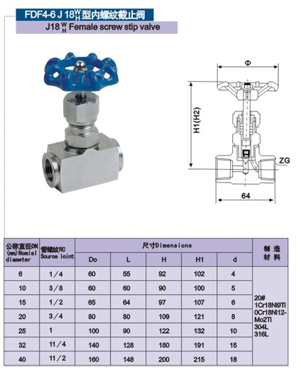 公稱壓力:PN2.5 PN4 PN6.4 PN16 PN32Mpa公稱通徑:DN5~DN25適用介質:油﹑水﹑氣等多種非腐蝕性或腐蝕性介質 適用溫度:-20℃~+440℃ -70℃~-240℃ ≤540℃ ≤570℃等制造材料:20#﹑1Cr18Ni9Ti﹑304﹑316﹑316L﹑12Cr1Mov等