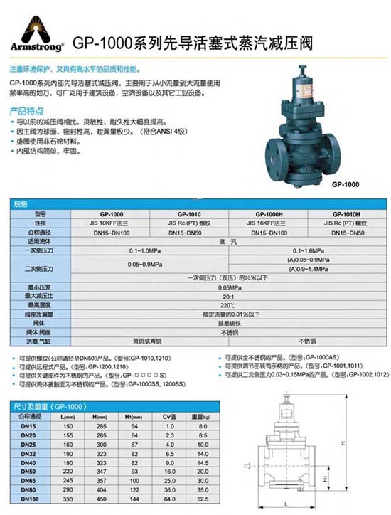 阿姆斯壯GP-1000系列減壓閥用于精確調(diào)節(jié)多種范圍的流體壓力。由于采用了內(nèi)導(dǎo)式設(shè)計(jì),因此無(wú)須外部零件和接管。