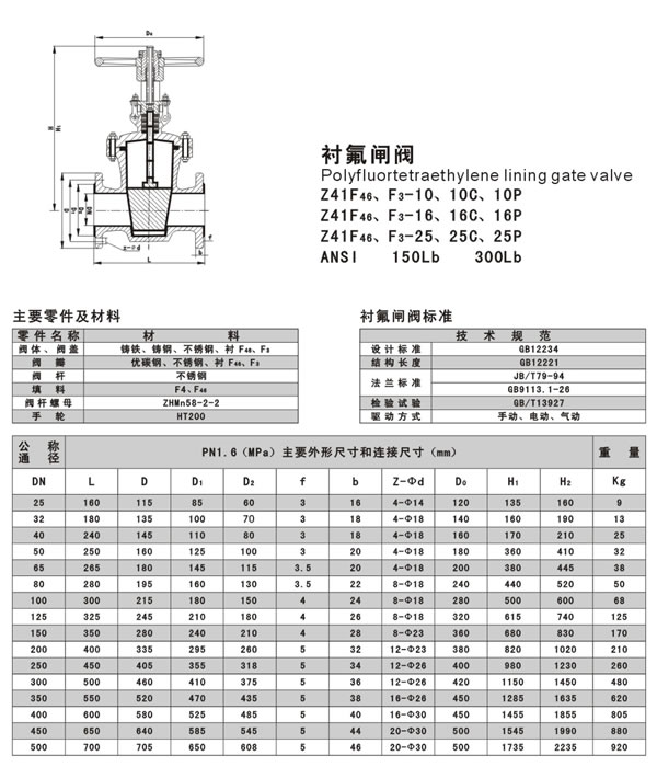 閘閥是一種帶見的啟閉閥門,利用兩側面密封呈楔狀的閘板來接通或截斷管路中介質,楔式閘閥不允許微量開啟在管路中作節流裝置用,以免因高速流動的介質沖蝕而加快密封面的損壞。FEP(F46)、PCTFE(F3)襯氟閘閥適用在-20℃~150℃的各種濃度的王水、硫酸、鹽酸、氫氟酸和各種有機酸、強酸、強氧化劑,FEP還適用于各種濃度的強堿有機溶劑以及其它腐蝕性氣體、液體介質的管路上使用。